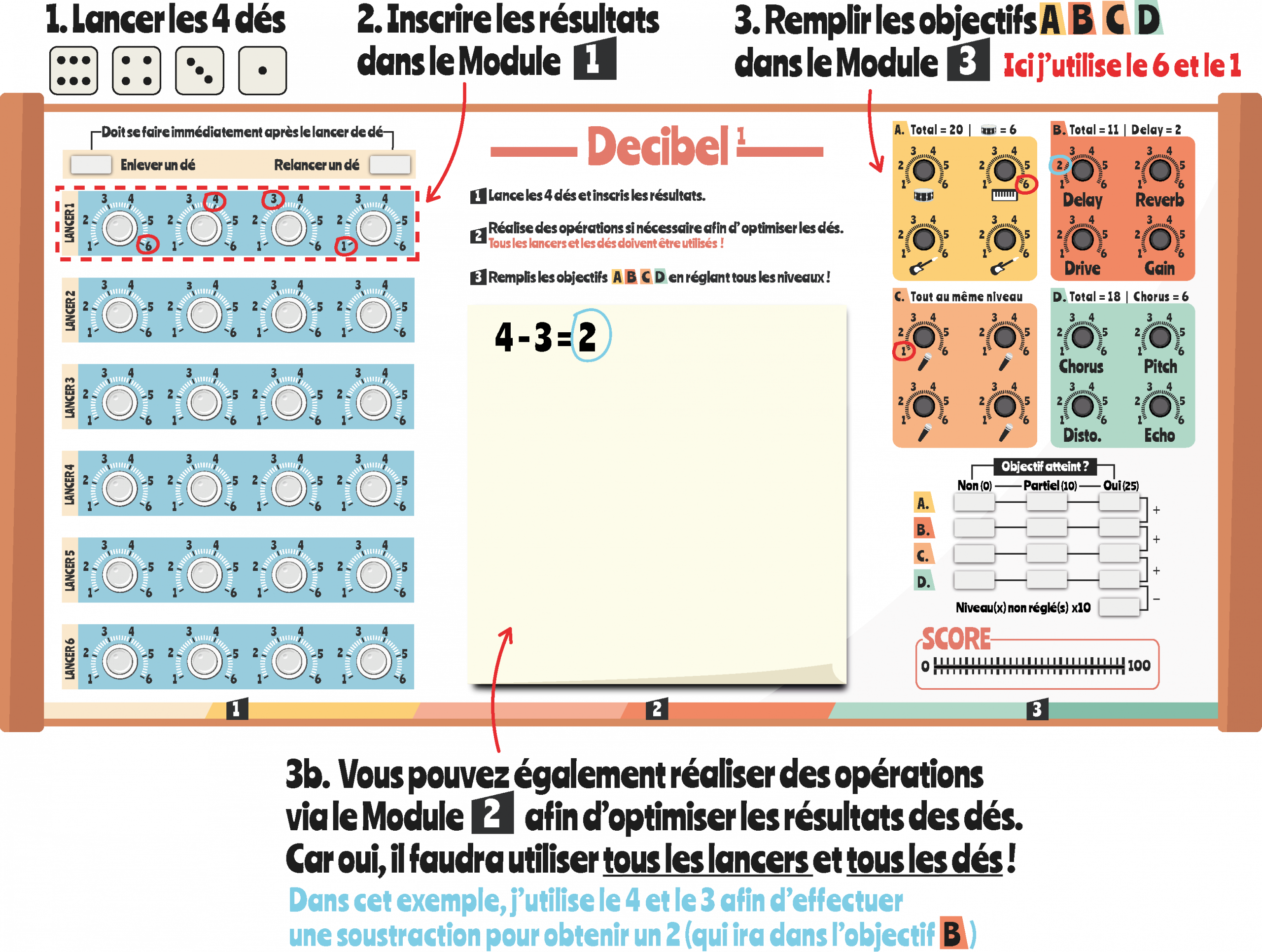 Le but est d’atteindre 100 points en réglant aux bons niveaux les potards de votre console, grâce à 4 dés et 6 lancers !